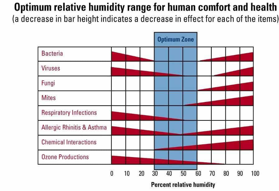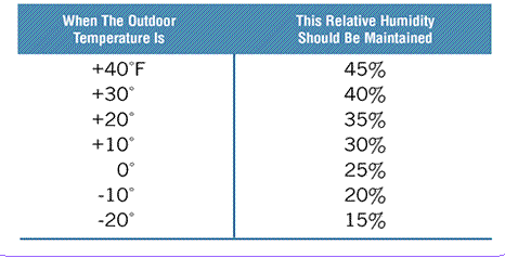 Of course, Indianapolis area temperatures don’t change quickly, right? It might be 70 degrees this Saturday and 20 degrees by next Monday, which requires an effort from your home comfort systems to combat that big change. As you’ll see in the chart, the ideal relative humidity levels fluctuate as outdoor temperatures change, but unfortunately most homes don’t change humidity levels.